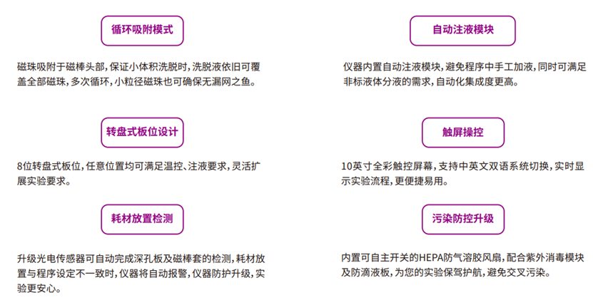 TGuide S96 Rex全自动核酸提取纯化仪基于磁珠法纯化原理,转盘式结构配合可升降温控模块,搭配精密柱塞泵,运行过程中可自动注液,实现全自动提取要求。仪器搭载10英寸大屏,触控操作系统,程序可编辑,易于操控。配置防滴液托盘、紫外灯、HEPA防气溶胶风扇,安全可靠。匹配不同试剂盒,可完成血液、组织、病毒、质粒等多种样本的自动化纯化,结果稳定,省时省力。24通量仪器还可同时兼容10 ml与15 ml深孔板耗材,满足更大上样量的需求。