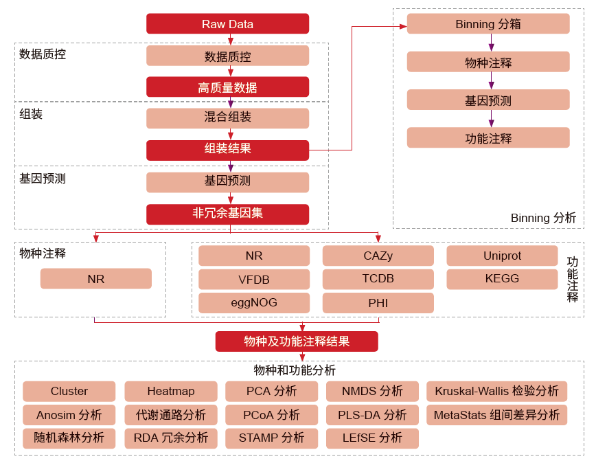 宏基因组( Metagenome,也称元基因组) 指环境中全部微小生物遗传物质的总和,它包含了可培养的和未可培养的微生物的基因,目前主要指环境样品中的细菌和真菌的基因组总和。以环境样品中的微生物群体基因组为研究对象,以功能基因筛选和/ 或测序分析为研究手段,以微生物多样性、种群结构、进化关系、功能活性、相互协作关系及与环境之间的关系为研究目的的新微生物研究方法,主要应用于群落结构分析、环境中的基因功能分析以及新物种的发掘。