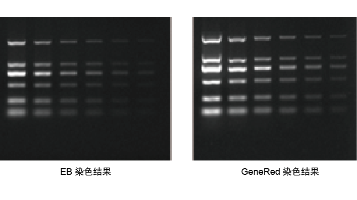GeneRed 红色核酸染料是一种代替 EB 的安全核酸染料,其原理是油性大分子,不易挥发,不能穿透细胞膜进入细胞内,该染料的诱变性远小于 EB,该产品适用于各种大小片段的电泳染色,对核酸迁移的影响较小,具有较高热稳定性,适用于使用微波或其它加热方法制备琼脂糖凝胶。