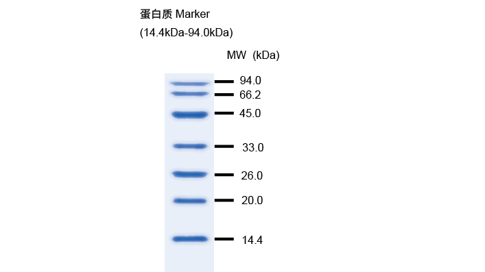 TIANGEN 公司研制生产的蛋白质 Marker 是由数种已知氨基酸序列蛋白质分别纯化后混合而成的蛋白质溶液,经 SDS-PAGE 凝胶电泳后用考马斯亮蓝染色可得清晰的蛋白带。建议使用分离胶浓度为 12%。