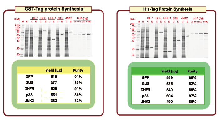 Buffer LM,加入模板后先完成 DNA 的转录,再配合麦胚无细胞蛋白表达系统预混 mix 完成 mRNA 的翻译,该 mix 中包含蛋白翻译的所有必需酶类、各种 tRNA 和离子,从而获取目的蛋白。本系列试剂盒可选择小、中、大三种表达规模,利用双层液相反应法(Bilayer)表达目的蛋白,小规模反应蛋白表达纯化后可达 500 µg 左右,大规模表达可达 4 mg,非常适合 Western Blot、CBB 染色等蛋白检测实验和蛋白结构解析以及免疫共沉淀、酶功能检测、抗体检测等常见蛋白质功能解析。特别地,本系列试剂盒还支持多个质粒模板在一个体系中同时表达,并且可以在表达之后正确模拟体内的蛋白复合体自组装。此外,本系列中的 C7H 和 C7G 试剂盒专门为表达 His 标签蛋白和 GST 标签蛋白做特殊优化,使得纯化后的蛋白纯度更高。