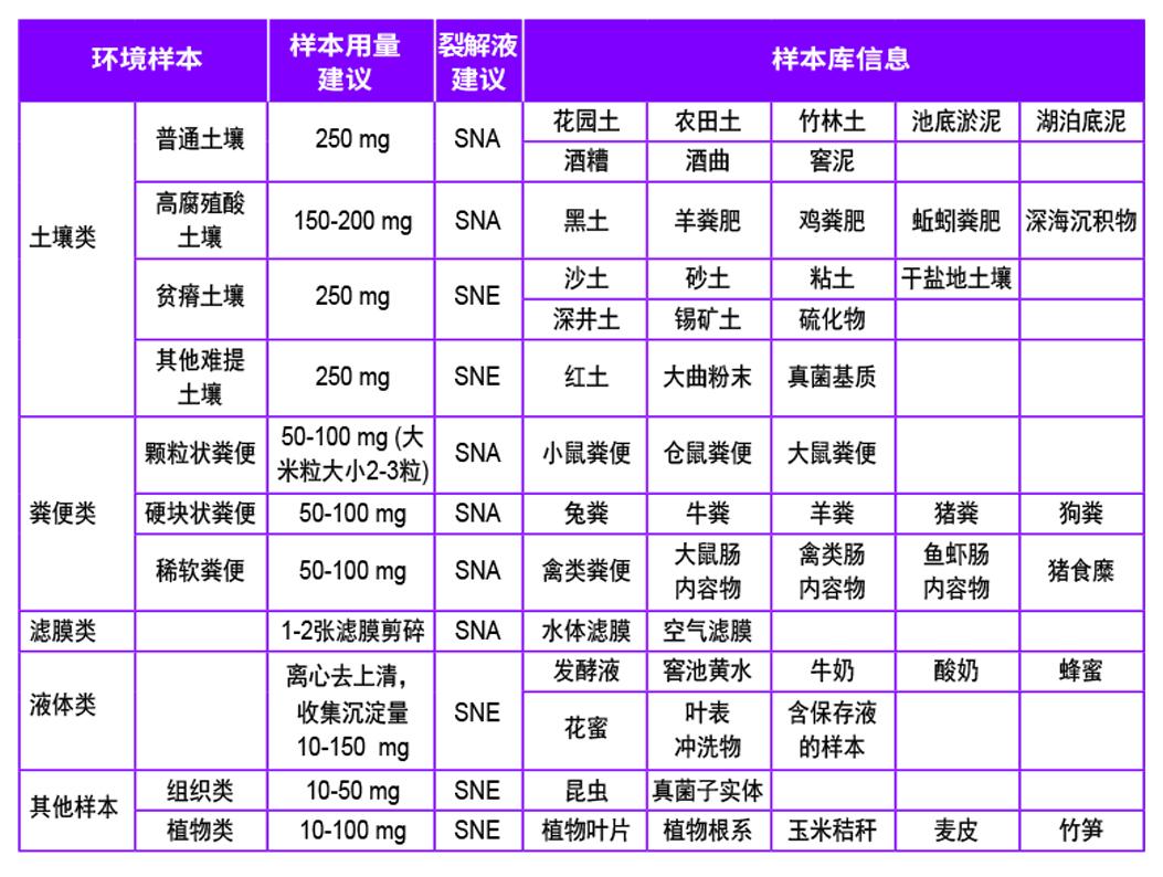 可从土壤、粪便、发酵产物、水体、池塘淤泥、海洋沉积物、肠道内容物等各种环境样本中,提取得到样本中的革兰氏阴性菌、革兰氏阳性菌、真菌等各种微生物基因组DNA